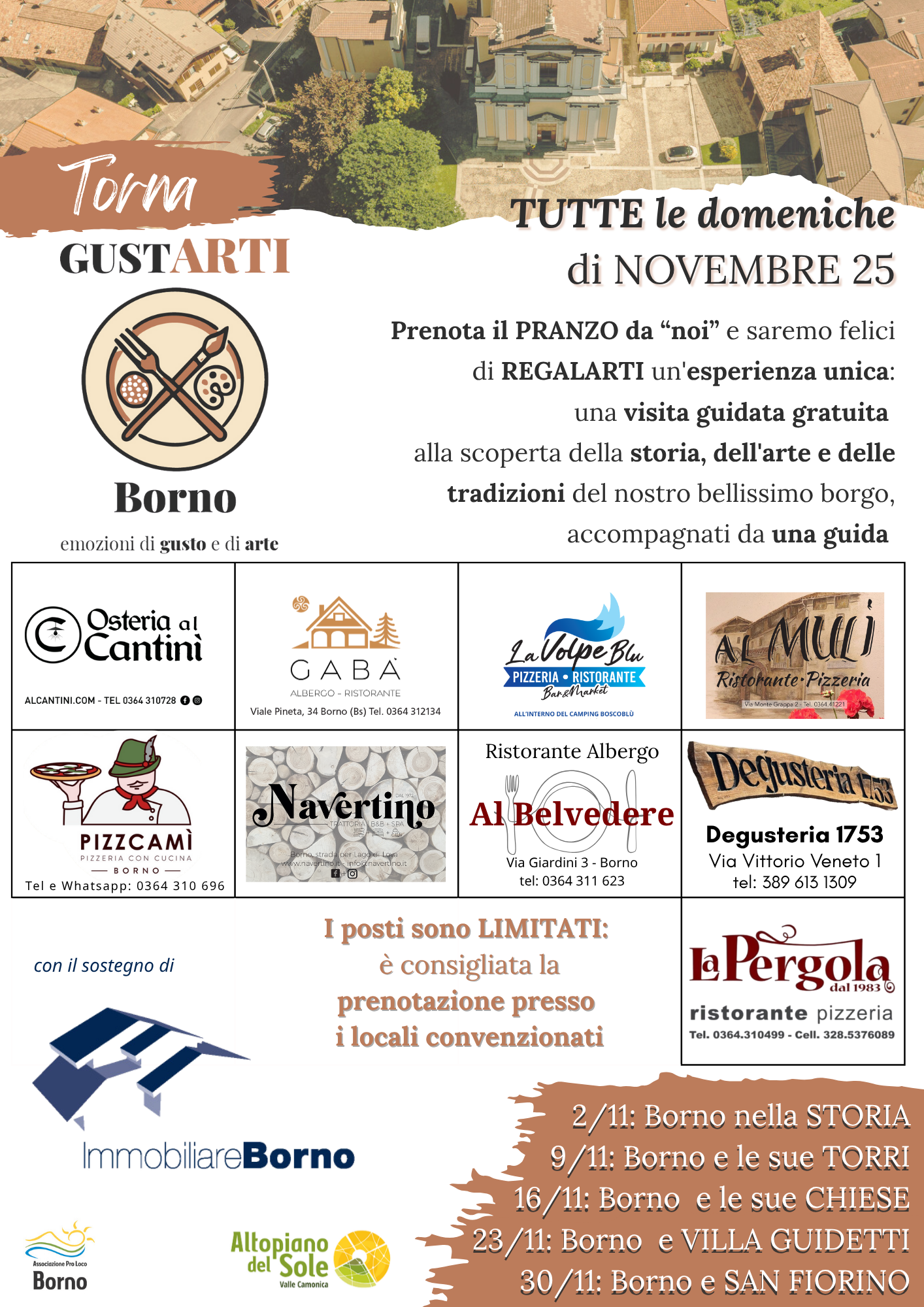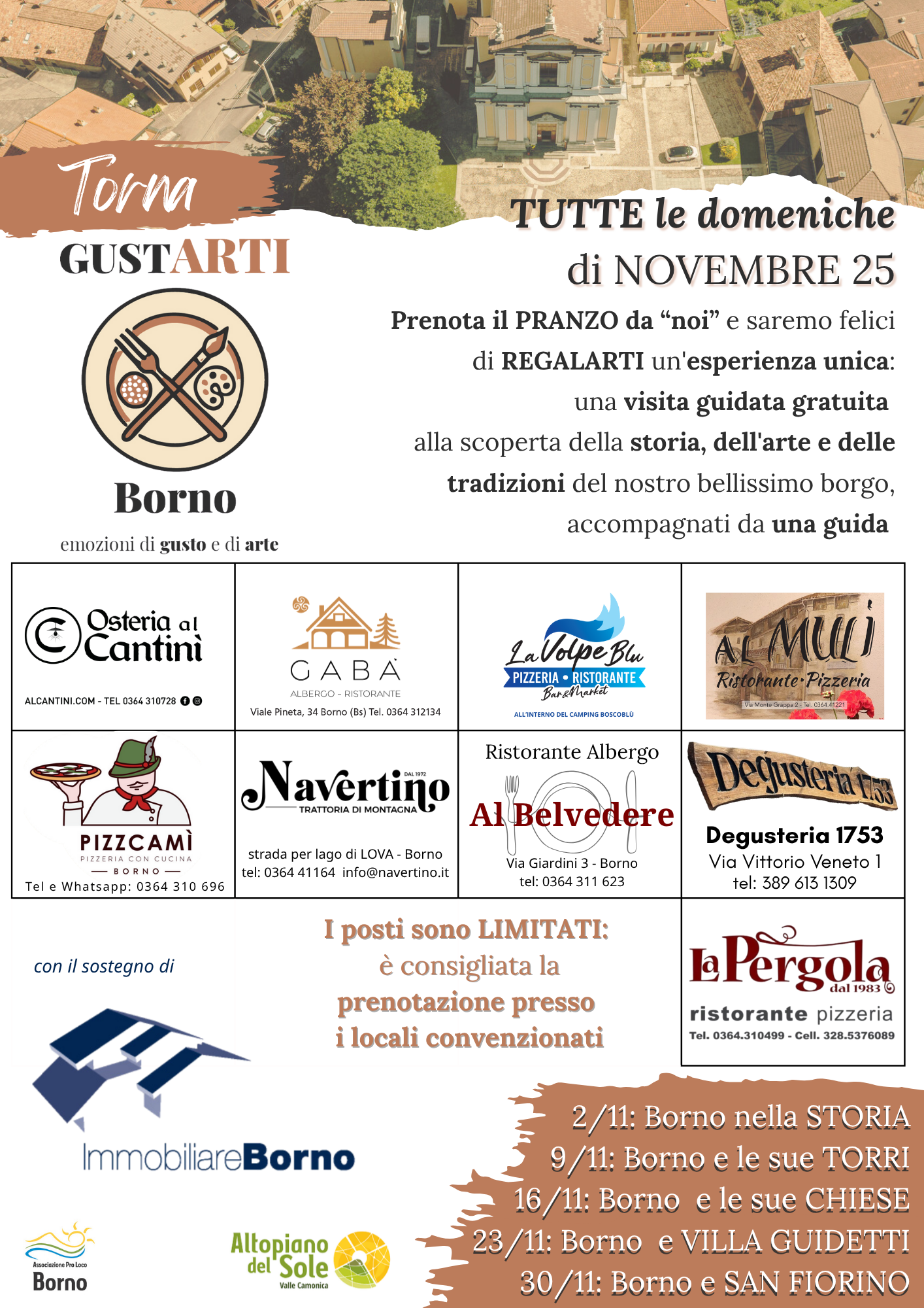 Dopo il successo della scorsa primavera, torna l’edizione autunnale di GustARTI Borno, l’iniziativa che unisce gastronomia, cultura e scoperta del territorio. Per tutto il mese di novembre, ogni domenica sarà dedicata a un percorso tematico alla scoperta della storia e delle bellezze del borgo di Borno. Chi sceglierà di pranzare in uno dei ristoranti aderenti riceverà un tagliando omaggio che permetterà di partecipare gratuitamente a una visita guidata professionale.